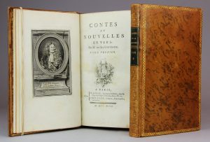 LA FONTAINE. Contes et nouvelles en vers. Paris, Plassan, Chevalier, 1792. 2 volumes in-8, basane racinée, dentelle dorée sur les plats, dos lisses ornés (Reliure moderne)Edition rare, elle est ornée de 2 portraits, 81 figures par Eisen et 59...