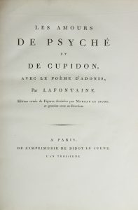LA FONTAINE. Les amours de Psyché et de Cupidon, avec le poème d’Adonis. Paris, de l’imprimerie de Didot le Jeune, l’An troisième (1795). Grand in-4° de [10]-234 pages, veau raciné, large dentelle dorée sur les plats, dos orné de lyres...