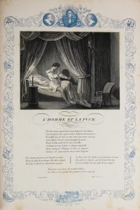 tout le texte et les gravures à mi-page sont placés dans de larges encadrements imagés tirés en bleu. Elle s’ouvre par un titre gravé suivi du portrait de La Fontaine et renferme 76 fables imagés par Goujet.