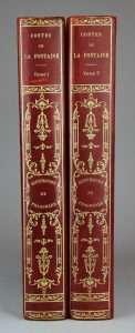 LA FONTAINE. Contes. Illustrations de Fragonard. Réimpression de l’édition de Didot, 1795, revue et augmentée d’une notice par Anatole de Montaiglon. Paris, Le Vasseur, 1891. 2 volumes in-4°, demi chagrin écrasé cerise, dos lisses ornés de...