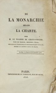 CHATEAUBRIAND (F.A. de). De la monarchie selon la Charte. Paris, Le Normant, 1816. In-8 broché, couverture bleues de l’époque, non rogné.Edition parue la même année que l’originale. Cernes clairs sur quelques feuillets, exemplaire à...