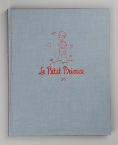 LE PETIT PRINCE. Avec dessins de l’auteur. New-York, Reynal & Hitchcock, 1943. Petit in-4° (23 x 18.6 cm). Cartonnage bradel gris-bleu, titre et dessin en rouge sur le premier plat, titre rouge au dos, sans jaquette. Edition originale. Bel...