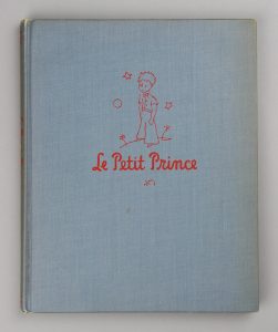 LE PETIT PRINCE. Avec dessins de l’auteur. New-York, Reynal & Hitchcock, 1943. Petit in-4° (23 x 18.6 cm). Cartonnage bradel gris-bleu, titre et dessin en rouge sur le premier plat, titre rouge au dos, sans jaquette. Mention “Second...