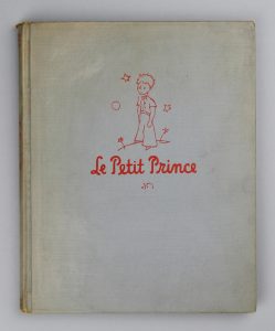 LE PETIT PRINCE. Avec dessins de l’auteur. New-York, Reynal & Hitchcock, 1943. Petit in-4° (23 x 18.6 cm). Cartonnage bradel gris-bleu, titre et dessin en rouge sur le premier plat, titre rouge au dos, sans jaquette. Mention “Third printing”...