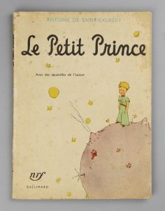 LE PETIT PRINCE. Avec dessins de l’auteur. Paris, Gallimard, 1947. Petit in-4° (22.1 x 16.5 cm). Broché, couverture rempliée illustrée.Tirage du 15 Décembre 1947. Couverture défraichie.