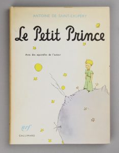 LE PETIT PRINCE. Avec dessins de l’auteur. Paris, Gallimard, 1970. Petit in-4° (22.1 x 16.5 cm). Cartonnage blanc illustré de l’éditeur, avec jaquette à rabats illustrée.Tirage du 15 Janvier 1970. Bel exemplaire.