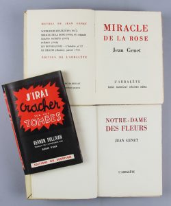 GENET (Jean). Notre Dame des fleurs. Lyon, L’Arbalète, 1948 – Miracle de la rose. Idem, 1956 (Ex. numéroté). 2 volumes in-8, brochés.Bons exemplaires. On joint : VIAN (B). J’irai cracher sur vos tombes. P. Editions du scorpion, 1946. In-12...