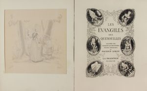 [LEROY (Maurice)]. Les Évangiles des quenouilles. (Paris), La Tradition, 1948. In-4° en feuilles, sous couverture, chemise et étui de l'éditeur.Luxueuse publication illustrée de 40 pointes-sèches de Leroy. Tiré à 330 exemplaires numérotés,...