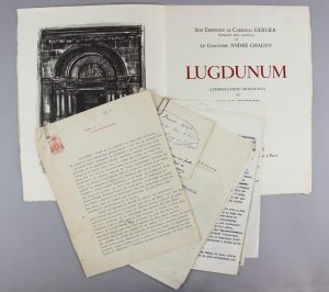 (Lyon). GERLIER – CHAGNY. Lugdunum. Lithographies originales de Pierre Théron. Paris, Pierre de Tartas, 1955. In-4° en feuilles sous chemise et étui de l’éditeur.EXEMPLAIRE UNIQUE imprimé sur japon nacré. Il comporte un dessin d’une...