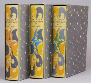 [MARDRUS]. Le Livre des Mille et une Nuit. Illustrations de Van Dongen. Paris, Gallimard, 1955. 3 volumes in-4°, cartonnages illustrés de l’éditeur, étuis.Les rhodoïds manquent sinon bon exemplaire.