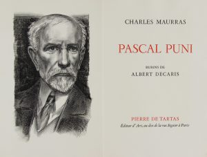 MAURRAS (Ch). Pascal Puni. Illustrations de Decaris. Paris, Pierre de Tartas, 1953. In-8 en feuilles sous chemise et étui.L’un des 150 exemplaires sur velin de Rives comprenant l’état définitif des 10 burins originaux de Décaris. Bon exemplaire.
