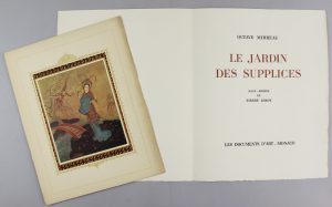 MIRBEAU (Octave). Le Jardin des supplices. Monaco, Les Documents d'Art, (1945). In-4° en feuilles, sous couverture, chemise et étui de l'éditeur.24 eaux-fortes par Pierre Leroy. Tirage à 540 exemplaires numérotés, celui-ci sur Johannot. Etui...