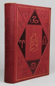 NOSTRADAMUS. Centuries et autres prophéties. Paris, Club du Livre, 1980. In-4° basane cassis, plats ornés à chaud et à froid, t. dorée, chemise et étui de l’éditeur.Orné de 23 lithographies originales hors texte en couleurs à fond doré...