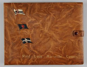 RAID MOTONAUTIQUE. Premier raid motonautique Lyon. Marseille. Cannes organisé par le Yacht Club du Rhône. 13-17 Juillet 1938. In-4° oblong, basane ornée, chemise et étui.Grande carte schématique du Rhône de Lyon à la mer dressée...