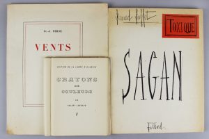 SAINT-JOHN PERSE. Vents. Paris, Gallimard, NRF, 1946. In-4°, broché, non rogné, partiellement non coupé. Edition originale numérotée sur chataignier. On joint : BUFFET (B). Toxique. Sagan. P., Julliard, 1964. In-4°, broché. - LARBAUD...