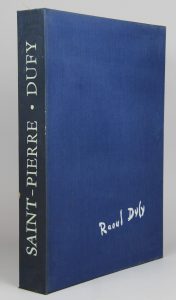 SAINT-PIERRE (Michel de). Les Côtes normandes. Illustrations de Raoul Dufy. Paris, P. de Tartas, 1961. In folio en feuilles sous chemise illustrée et coffret bleu de l’éditeur.EDITION ORIGINALE. 25 belles compositions dont 14 à double page,...