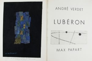 Verdet et Max Papart. Un des 100 exemplaires numérotés sur grand vélin de Rives, illustré de 7 eaux-fortes originales en couleurs de Max Papart (dont le titre) ; il est enrichi d’un grand dessin en couleurs signé, d’un collage original à pleine page rehaussé à l’encre signé et dédicacé à Monsieur Durand par Max Papart, une maquette d’une page de texte et 3 eaux-fortes refusées. Bel exemplaire.