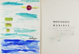 VERDET (André). Montagnes marines. Lithographies de Jean Cocteau. Gières, les Messagers du livre, 1961. In-4° en feuilles, sous chemise et étui bleu clair de l’éditeur.Edition originale orné de 9 lithographies en couleurs de Cocteau (sur...