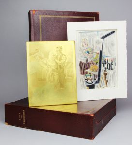 des soixante. Il contient 2 états des illustrations, Etat en noir et Etat en couleurs. Il est complet de la seconde illustration des 30 eaux-fortes par Courbouleix en 2 états et enrichi d'un dessin original au crayon et à l'aquarelle de Dignimont et d’un cuivre original ayant servi à l’illustration. Les suites sont contenues dans un second coffret identique. Traces d’usure, un fermoir manquant
