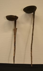 BAMBARA (Mali).- Ensemble de 2 réceptacles en fer forgé, l'un avec le support torsadé, l'autre avec le support en forme de lance. Hauteur : 44,5 et 52 cm.