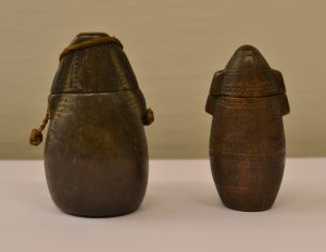 BAS-CONGO (R.D.C.).- Ensemble de 2 poires à poudre. 1. Hauteur 12,5 cm, entièrement sculptée, sans le cordonnet.- 2. Hauteur : 14 cm, couvercle et bord supérieur de la poire sculptés, avec cordonnet.
