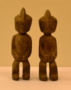 BURKINA FASO (?).- Couple de 2 petites statues en bois, dont la tête est marquée de stries verticales pour figurer les cheveux. Hauteur : 21 et 21 cm.
