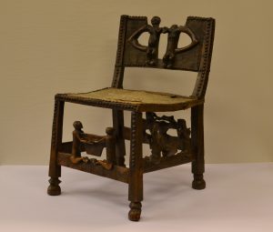 CHOKWE (R.D.C.).- Chaise en bois recouverte de peau (poils usés). Dossier et barres de soutien entièrement décorés de personnages, de motifs géométriques (3 sur 4) et de clous à tête arrondie. Au dossier : le sein gauche de la femme manque...