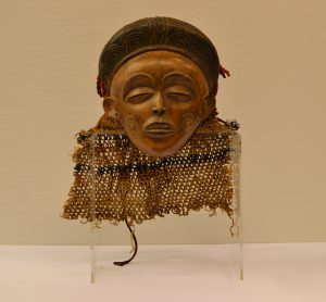 CHOKWE (R.D.C.).- Masque en bois surmonté d'un diadème en bois sculpté, la coiffure en raphia teinté en rouge, filet tressé à l'arrière du masque.