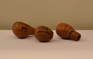 CONGO (R.D.C.).- Ensemble de 3 calebasses pyrogravées à motif d'animaux. Format : de 11 x 10 x 10 cm à 24 x 11 x 11 cm (plusieurs restaurations et fêlures). Initiales P/G.