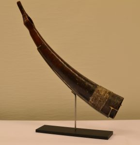 CONGO (R.D.C.).- Trompe d'appel en bois poli ornée à sa plus grande ouverture d'un treillage métallique qui entoure la trompe. Elle est présentée sur tige métallique et support. Très belle patine.