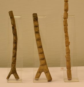 DOGON (Mali).- Ensemble de 3 échelles miniatures en bois. Hauteur : 32, 32 et 40,5 cm (bois fissuré à cette dernière).