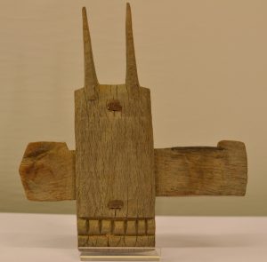 DOGON (Mali).- Petite serrure de porte en bois (dont la base est sculptée) + fer. Hauteur : 26 cm, largeur : 23,5 cm.