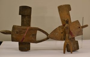 DOGON ? (Mali).- Ensemble de 2 serrures de porte (41 x 31 cm et 38 x 44,5 cm)./ Sculpture en bois représentant un oiseau (manque le bord d'une aile). Hauteur 28 cm./ Ens. 3 pièces.