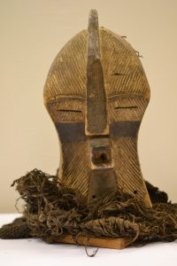 KIFWEBE SONGYE (R.D.C.).- Masque en bois dont la surface est entièrement décorée et fibres végétales. Hauteur : 45 cm.