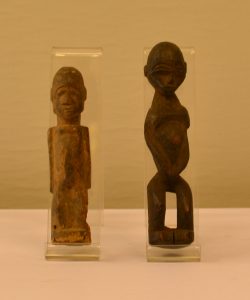 LOBI (Burkina Faso).- Ensemble de 2 petites statues en bois. 1. Hauteur : 17 cm, base abîmée et manque de matière sur le côté inférieur.- 2. Hauteur : 20 cm, bois fendu au dos et sur le côté de la tête.