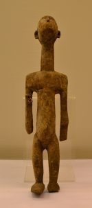 LOBI ? (Burkina Faso).- Grande statue en bois non poli (1 pied cassé), un des bras est orné d'un petit bracelet de coquillages. Hauteur : 90 cm.