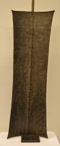 MASAI.- Bouclier en tôle monté sur socle métallique (griffé), au dos poignée en bois avec attaches en cuir tressé. Hauteur : 84 cm, largueur la plus étroite 22 cm.