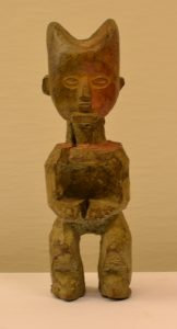 TEKE (R.D.C., République du Congo, Gabon).- Petit fétiche bicorne, pigments rouges sur le visage et à la base du cou. Hauteur : 36 cm (arrière de la tête et avant du cou fendus).