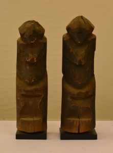 TOGO.- Couple de statues en bois, chacune montée sur socle en bois (bois fissuré à l'arrière).