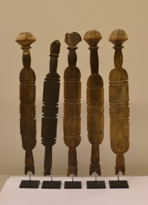 TOUAREG (Niger).- Ensemble de 5 piquets de tente, plats des piquets décorés de motifs géométriques, la partie enfoncée dans le sol est abîmée. Présentés sur tige métallique et support. Hauteur entre 73 et 76 cm.