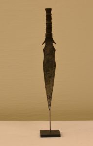 ZOULOU (Afrique du Sud). Dague (bois et métal). Hauteur : 36 cm. Montée sur tige métallique et socle.