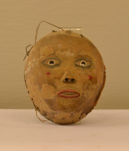 CONGO (R.D.C.).- Petit masque peint en bois (lèvres et pommettes en rouge, contour des yeux argentés, traces de raphia et de tissu au bord du masque (reste d'argile, haut du crane fissuré). Hauteur 20 cm.
