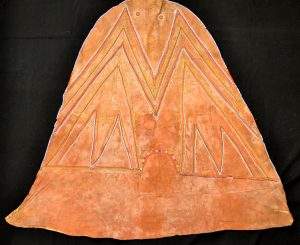 MASAI.- Tablier en cuir triangulaire décoré de rangées de perles cousues. Dim. : hauteur : 102 cm, largeur : 125 cm.