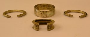 BORNEO (Kalimatan, Indonésie). Ensemble de 4 bracelets en argent ouvragé, dont 2 se terminent par des têtes de serpents.