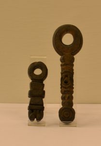 NEPAL.- Ensemble de 2 bielles de baratte en bois. Hauteurs : 17 et 29 cm.