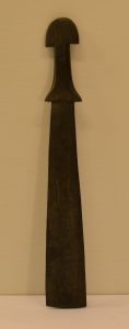 PAPOUASIE (Iles Trobriand, Nouvelle-Guinée). Pagaie en bois dont la partie inférieure est décorée de motifs géométriques. Longueur : 57 cm.