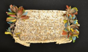 AMAZONIE.- Cache-sexe de forme trapézoïdale composé de perles faites de petites graines coupées en deux enfilées sur fil de coton, base inférieure décorée d'une frange en coton, bords latéraux ornés de plumes d'ara de différentes...