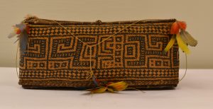 WAI-WAI (Guyana).- Panier de Chaman rectangulaire avec couvercle, en fibre végétale tressée, le couvercle est décoré de motifs géométriques dont les coins sont ornés de plumes de différentes couleurs. Il est destiné à la récolte...