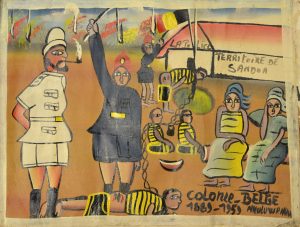 NKULU WA NKULU (Edouard). "Colonie belge 1889-1959". Huile sur toile americani, signée au coin infér. droit. Dim. support : 46 x 56 cm ; sujet : 39 x 49,5 cm. Scène de fouet dans une prison du territoire de Sandoa dans la province du Katanga.