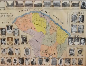 Bosobolo.- "Territoire de Bosobolo" [Bosobolo est un territoire de la province de l'Équateur en République démocratique du Congo]. Carte manuscrite rehaussée de couleurs à l'aquarelle, entourée de 33 photos au format de 5,5 x 4 cm (employés...